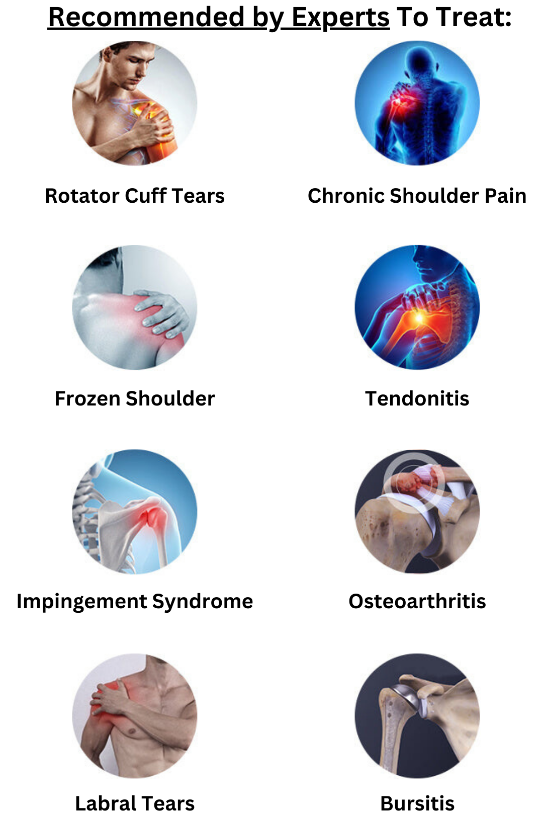 Syndrome, Arthritis, Tendinitis, Bursitis, Shoulder Instability and Post-Operative Recovery.