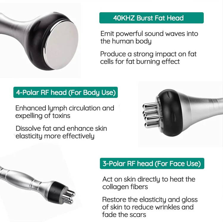 Emits 40,000Hz sound waves to break apart fat cells, enhance blood circulation, and stimulate lymphatic drainage. Perfect for cellulite reduction and body contouring.